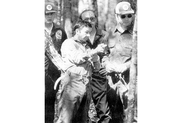 Дональд Гаскинс в лесу во время одной из своих многочисленных «выводок» (следственных экспериментов на местности). Преступник указал множество десятков мест, где совершал убийства и прятал тела своих жертв, однако примерно в 2/3 случаев его рассказы не подтверждались изучением объектов и следов на местности.