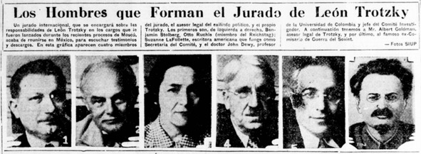 Пятеро авторитетных деятелей левого движения должны были предоставить возможность Троцкому ответить на обвинения Сталина и тем самым оправдаться в глазах «передовой» международной общественности. На этой иллюстрации представлен анонс непредвзятого допроса Льва Троцкого, и в числе членов группы допрашивающих можно видеть Сюзанну Ла Фоллетто – она единственная женщина в ряду довольно непрезентабельных мужчин. Но если вы, несмотря на эту подсказку, не увидели среди них непрезентабельную женщину, то сразу сообщим верный ответ – она третья слева.