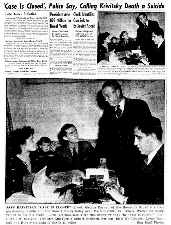 Начальник Отдела расследований убийств столичного Департамента полиции лейтенант Джордж Дарнелл (George Darnall) лично допросил 12 февраля семью Доберт – Эйтеля, Маргариту и их малолетнего сына Стефена (Стивена) – для чего специально приехал из Вашингтона в Шарлоттсвиль. После окончания допроса главный столичный детектив сообщил журналистам, что «дело Кривицкого» закрыто. Расследовать, дескать, нечего – это однозначно суицид! В тот же день вечерние газеты сообщили читателям об этом немаловажном событии. На этой иллюстрации показана 1-я полоса номера «The evening star» от 12 февраля (вверху), а на нижней – фотография Дарнелла (он стоит) и семьи Доберт.