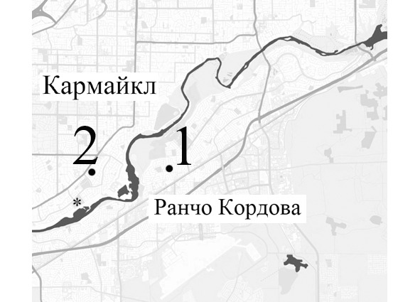 Карта расположения мест нападений насильника из восточного Сакраменто летом 1976 г. Условные обозначения: 1 – место первого нападения в г. Ранчо Кордова 18 июня 1976 г., 2 – второй эпизод в г. Кармайкл в ночь с 16 на 17 июля того же года, знак * обозначает расположение школы «Рио Американо хай скул», в которой обучались потерпевшие. Бросается в глаза, что точки 1 и 2 удалены друг от друга на незначительное расстояние (примерно 3,5 км.) и расположены практически симметрично относительно поймы реки Америкен и парковой зоны, устроенной там.