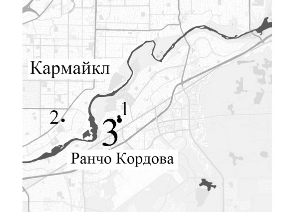 Географическое распределение мест нападений насильника из восточного Сакраменто летом 1976 г. Условные обозначения: 1 и 2 – места первых криминальных эпизодов в июне и июле, 3 – место нападения в ночь на 29 августа на семью в доме на Малага-вэй в г. Ранчо Кордова. Домовладения, явившиеся местами преступлений и обозначенные 1 и 3, находятся в непосредственной близости, расстояние между ними составляет всего-то 50—60 м.