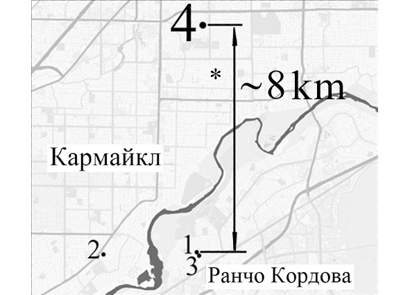 Географическая локализация мест нападений насильника из восточного Сакраменто летом и в начале осени 1976 г. Условные обозначения: 1, 2 и 3 – места нападений в летние месяцы в их хронологической последовательности, 4 – место нападения на Дебби Патрик в доме её родителей 4 сентября, знак * обозначает место, в котором оказалась найдена автомашина потерпевшей, угнанная насильником.