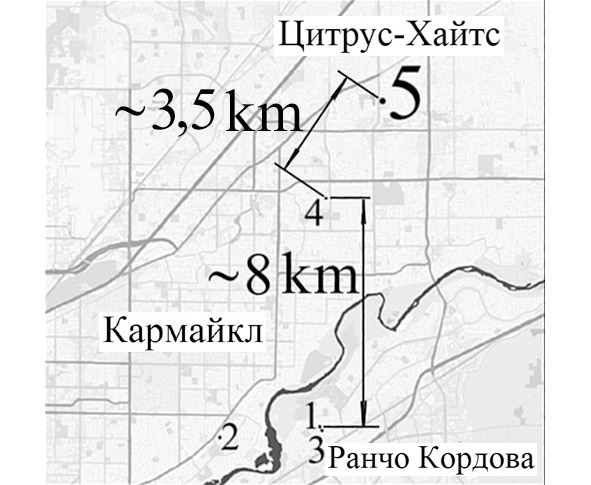 Географическая локализация мест нападений насильника из восточного Сакраменто летом и в начале осени 1976 г. Условные обозначения: 1—4 – места первых криминальных эпизодов в их хронологической последовательности, 5 – место нападения утром 5 октября в г. Цитрус-Хайтс. Нетрудно заметить, что после первых нападений, локализованных на очень небольшой территории, преступник принялся расширять область своей активности («ареал»). Это типичное для многоэпизодных сексуальных преступников поведение – свои первые вылазки они обычно совершают в непосредственной близости от места проживания, а затем, получив первый опыт, уходят из этого района, рассчитывая сбить с толку правоохранительные органы.