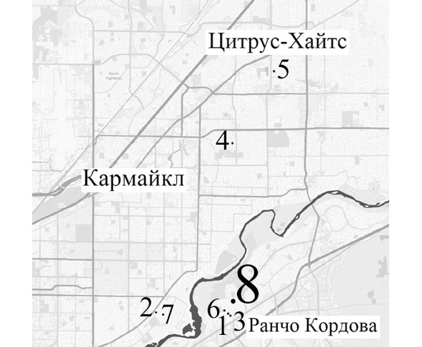 Географическая локализация мест нападений насильника из восточного Сакраменто летом и осенью 1976 г. Условные обозначения: 1—7 – места первых нападений в их хронологической последовательности, 8 – место нападения вечером 18 октября 1976 г. в г. Ранчо Кордова. Из 8 преступных посягательств, совершенных за 4 полных месяца (с 18 июня по 18 октября), 6 пришлись на весьма ограниченный район рядом с долиной реки Америкен. Площадь этой зоны менее 4 км2 и преступник, безусловно, знал её как свои пять пальцев. Тому могло быть множество объяснений: преступник мог жить здесь ранее, он мог хорошо изучить район, будучи сотрудником коммунальных служб, он мог часто бывать там во время велосипедных прогулок, ведь в долине реки Америкен очень много велодорожек… Причин особой осведомленности преступника в географии этих мест могло быть множество, причём, совершенно невинных. Выяснение этих деталей должно было стать одним из приоритетов расследований, проводимых департаментами полиции Кармайкла и Ранчо Кордовы. Если бы только полицейским удалось понять, как преступник выбирает жертву и готовится к нападению, они бы без проблем арестовали его с поличным во время очередной вылазки…
