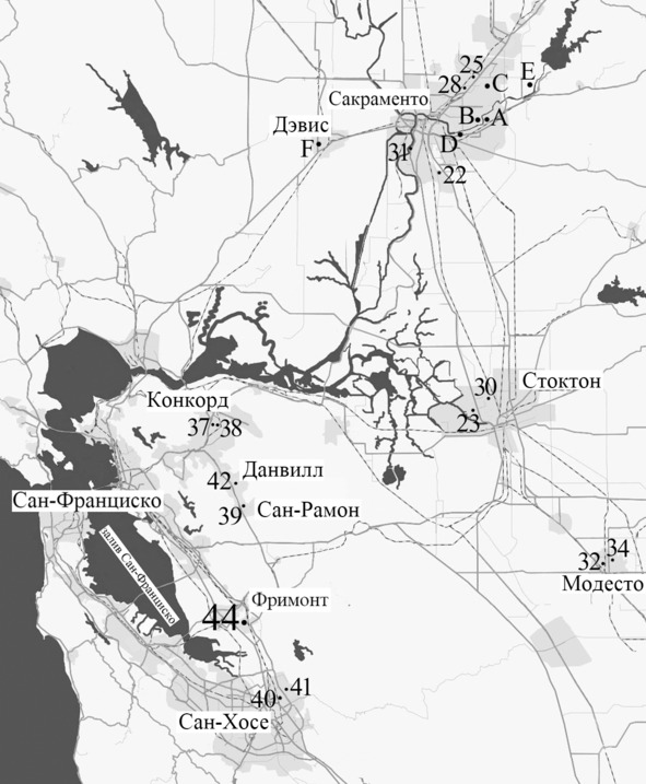 Географическая локализация нападений Гиены в северных районах Калифорнии по состоянию на начало апреля 1979 г. Точками «A», «B», «C», «D» и «F» обозначены места, где на очень компактной территории (менее 2 км2) имели место 3 и более нападений преступника. Точками и соответствующими числами обозначены вылазки насильника в порядке их совершения. Число 44 показывает место нападения Гиены в ночь на 5 апреля 1979 г в г. Фримонт, жертвами которого стали Брэд Эриксон и Джин Бомонт.