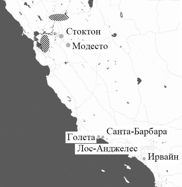Карта Калифорнии. Штриховкой выделены зоны активности Гиены в 1976 – 1979 гг на севере штата – в районах Сакраменто и залива Сан-Франциско. Там же, на севере, показаны города Стоктон и Модесто, в которых насильник из восточного Сакраменто также совершил несколько нападений. Города Голета, Санта-Барбара, Лос-Анджелес и Ирвайн расположены на юге штата и удалены от мест активности Гиены на многие сотни километров (от Голеты до района Сан-Франциско более 350 км). Следует обратить внимание на то, что Голета и Санта-Барбара находятся севернее Лос-Анджелеса, а Ирвайн – южнее. В контексте последующего повествования указанные нюансы будут иметь значение.