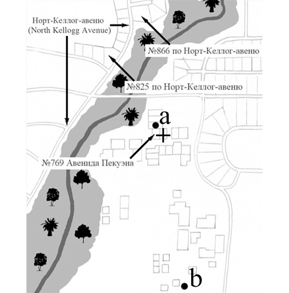 В ночь на 30 декабря 1979 г Роберт Офферман и Александра Мэннинг приехали в дом №767 по Авенида Пекуэна (обозначен «*») около полуночи. Звук мотора автомобиля Оффремана и голоса на парковке слышали соседи. Около 3 часов ночи была слышна стрельба, но источник её никто из свидетелей определить не смог, поэтому полицию местные жители не вызвали. Утром выяснилось, что из двора одного из домов по соседству (точка «1») исчез велосипед. Вечером 30 декабря его нашли неподалёку от улицы Агано-драйв примерно в 400 м к югу от места похищения (точка «2»).