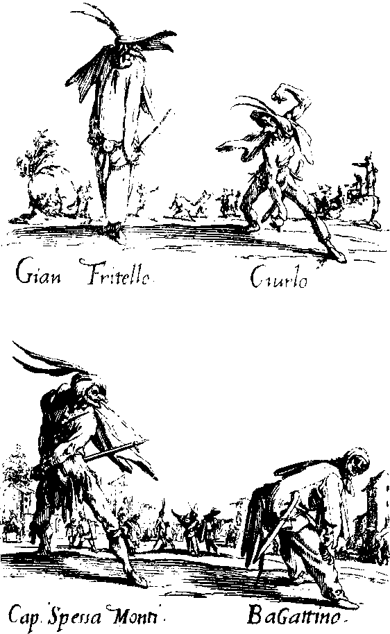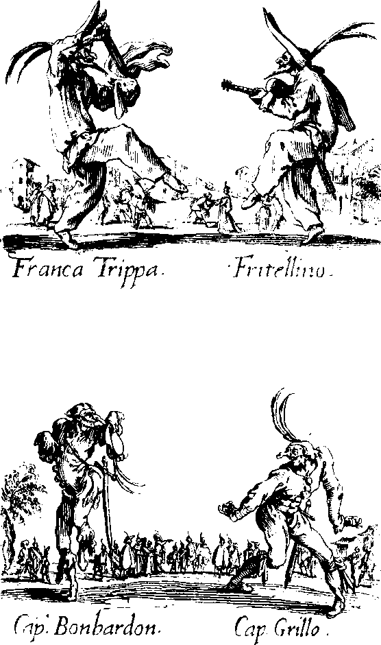 В этот первый период жизни театра буффонные элементы сосредоточивались главным образом в двух моментах спектакля: в конце первого акта и в конце второго. По крайней мере, так было в северных сценариях. Буффонада тогда воплощалась в «лацци». Слово «лаццо» есть диалектизированное l’atto, т. е. действие, а «лацци» – множественное число того же слова. Лаццо означает буффонный трюк, не связанный непременно с сюжетом и исполняемый чаще всего одним или двумя дзани. Существуют длинные перечни лацци, некоторые из них дожили в качестве цирковых номеров и до наших дней. Таково, например, лацци с мухой. Оно заключается в том, что дзани делает рукой жест, как будто ловит в воздухе муху, потом мимикой показывает, что он обрывает ей крылышки и ножки и бросает ее себе в рот. Но огромное большинство лацци, например, те, которые целыми каталогами фигурируют в книге Андреа Перуччи, очень редко сопровождаются объяснениями. Их комическое действие поэтому для нас утеряно.