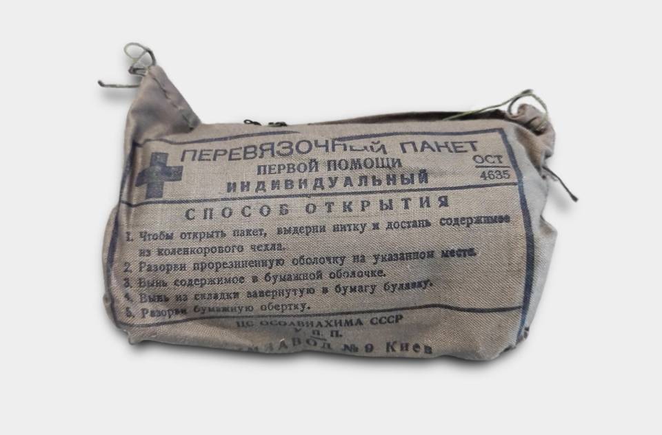 [1] Перевязочный пакет первой помощи. Индивидуальный, 1941 г. В годы Великой Отечественной войны таких индивидуальных перевязочных пакетов было израсходовано около 100 млн.