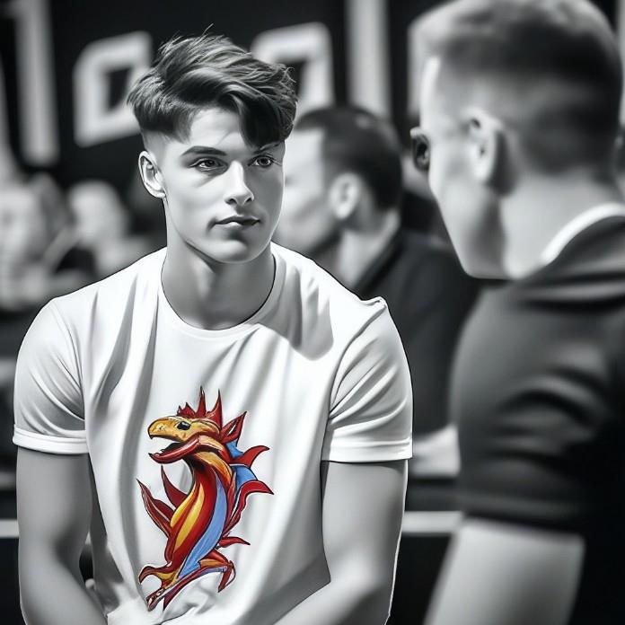 Так и идем на пресс-конференцию посмеиваясь четверо достаточно взрослых мужчин в классических брюках и белых рубашках, и непонятный высокий темноволосый пацан в белых джинсах, и футболке с драконами.