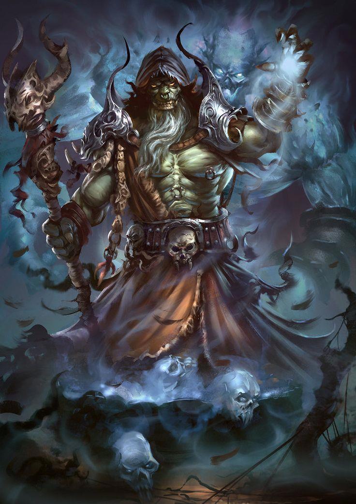 В этот момент я заметил, как вместе с одной из пачек нежити на территорию деревни вошёл здоровый орк. Выглядел он совершенно не так, как те, кого я видел до сих пор. Он был в зловещем доспехе с черепами и стальными наплечниками. В его руках был здоровенный посох, на вершине которого крепился рогатый череп. Из-под ног орка струилась какая-то потусторонняя мгла, в которой даже прослеживались силуэты черепов.