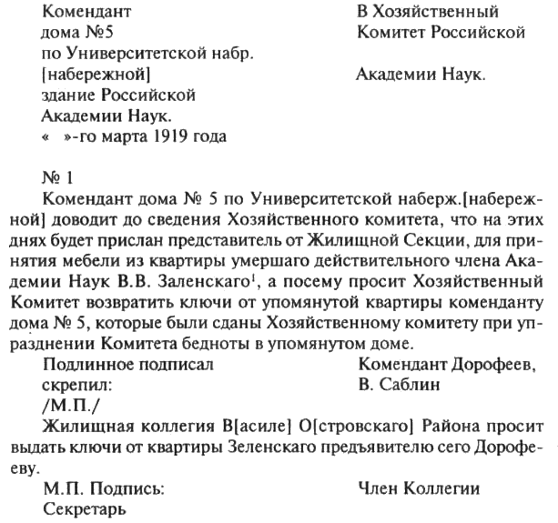 Комендант дома № 5 по Университетской наберж.[набережной] доводит до сведения Хозяйственного комитета, что на этих днях будет прислан представитель от Жилищной Секции, для принятия мебели из квартиры умершаго действительного члена Академии Наук В. В. Заленскаго [479]479
