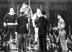 Если легковесы сражались «бескровно», то в следующей весовой категории произошло одно из самых ярких и волнующих событий. Здесь встретились два олимпийских чемпиона – Федор Богдановский и Томми Коно, который совершенно неожиданно перешел в этот вес. В жиме лучшего результата добился Коно – 135 килограммов. Богдановский отстал от него на 2,5 килограмма. В рывке у Богдановского – 127,5 килограмма, у Коно – 122,5. Начинается толчок. Коно фиксирует 162,5 килограмма, Богдановский – 160. В результате оба они набирают одинаковую сумму. Но у Коно собственный вес оказался на 100 граммов меньше, чем у Богдановского, и он завоевывает своей команде золотую медаль – первую и последнюю на этом чемпионате.