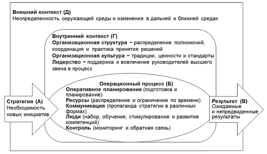 Логика модели состоит в следующем: на входе организация имеет Разработанную стратегию (A), которая предопределяет необходимость новых инициатив. Собственно реализация включает Операционный процесс (Б). В рамках данного процесса осуществляется как планирование реализации стратегии, так и исполнение этих планов. В том числе это планирование и исполнение комплекса мероприятий, необходимых для реализации стратегии в части ресурсов, коммуникаций между участниками процесса, работы с человеческим капиталом и контроля за реализацией целей и планов. Конечным итогом этого процесса является запланированные и не запланированные результаты. На схеме так и указано – Результат (В).