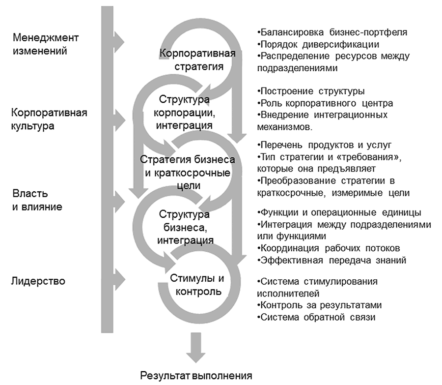 Модель, представленная на рис. 2 состоит из двух частей. Центральная часть показывает логический поток выполнения решений или действий. Стрелки на рисунке показывают этот поток. Справа от потока краткое содержание действий. Стимулы (стимулирующие воздействия по отношению к персоналу), например, указаны последними в модели, потому что стимулы не могут быть установлены до тех пор, пока не будут приняты предварительные решения о стратегии, краткосрочных задачах и структуре. Логично, что стимулы должны вознаграждать и подкреплять правильные решения, которые должны бесспорно предшествовать разработке этих стимулов. В тоже время корпоративная стратегия стоит во главе этого перечня действий. Это тоже логично, стратегия бизнес-единицы не может противоречить корпоративной стратегии, поэтому решения о стратегиях бизнеса основываются на корпоративной стратегии.