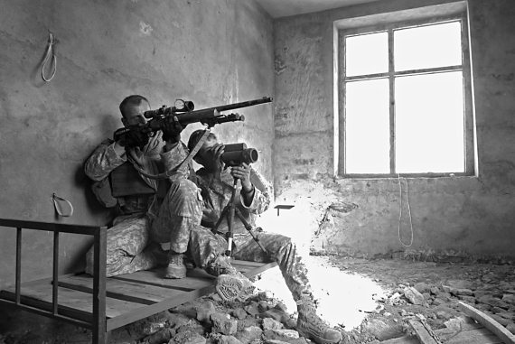 Американская снайперская пара. Бойцы грамотно и с комфортом расположились в глубине помещения. Второй номер ведет наблюдение с помощью мощного монокуляра