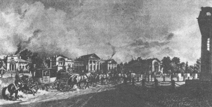 1812—1814 годы являют ощутимую грань и в строительстве. Из развалин, обгоревших обломков возникает новая Москва, и действительно: "Пожар способствовал ей много к украшенью". Громадные полуобгорелые дворцы – и среди них Пашков дом, дома Куракиных, Разумовских, Мусин-Пушкиных, Чернышевых, Бутурлиных, Еропкиных, Талызиных, Баташевых – отремонтированные и отделанные вновь – оказались свидетелями уже отживших вкусов вельможного, слегка фрондирующего барства екатерининской эпохи. На них смотрели с любопытством, чуть-чуть с иронией, но вместе с тем и с несомненным уважением, совершенно так же, как на стариков екатерининской эпохи, появлявшихся на балах в мундирах старых форм, в коротких панталонах и башмаках с пряжками...