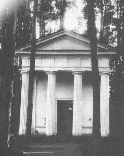 Мечеть. Это павильон с двумя минаретами, как того требовала эпоха классицизма, во всем стремившаяся к симметрии. Прелестное игрушечное здание это замыкало перспективу всей парковой планировки – от центральной оси дома, через партер, террасы регулярного сада, обелиск, водоем и канал. Как это нередко случалось при проектировке павильонов, беседок, мостиков и других парковых украшений, мечеть в саду чернышёвской усадьбы была заимствована из изданий чертежей знаменитого в свое время английского архитектора, теоретика и практика садового искусства Чемберса. Павильон являлся едва ли не единственным в усадебных парках образчиком своеобразной turquerie* (* туретчина (франц.).), одного из течений столь свойственной искусству XVIII века экзотики. Пожалуй, единственным аналогичным памятником является Турецкая баня на берегу озера в Царскосельском парке. Участь мечети разделила колонная беседка – дорический четырехколонный простиль с треугольным фронтоном, – беседка, стоявшая неподалеку от пруда на высоком холме, поросшем вековыми соснами. Здесь находилась некогда фигура Екатерины II – и все сооружение, таким образом, и по идее своей, и по типу архитектуры напоминало строго, но изысканно скомпонованный Т. де Томоном павильон “Супругу-Благодетелю" в Павловске. Погиб также очаровательный неподалеку находившийся «эллиптический павильон» под плоским куполом, украшенный кругом шестнадцатью стройными колоннами с капителями какого-то фантастического «псевдокоринфского» ордера. Беседка эта, с четырьмя совсем простыми входами, близко напоминала подобную же постройку в Павловском парке – известный “Храм Дружбы" в долине Славянки, неподалеку от Большого дворца. Не осталось следа и от бани – небольшого здания с лоджиями и четырехколонным портиком; пустая яма и на месте обелиска, посвященного памяти кн. Г.А. Потемкина...