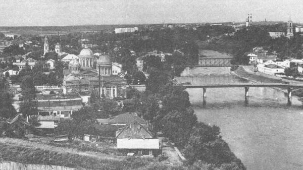 Тверская часть города тянется к базарной площади; здесь арки екатерининских рядов, классический храм ротондального типа. Улицы разбегаются по зеленым склонам, сверху на базарную площадь приводит лестница из каменных плоских плит. В этой части города мало старых построек; на одной из улиц, прямых, травой поросших немощеных “проспектов”, стоит типичный дворянский домик-особнячок с колонным портиком, принадлежавший художнику барону Клодту; на каком-то из обывательских домов уцелели любопытные резные из дерева фигуры ангелов – верно, жил здесь когда-то резчик церковной скульптуры. У многих владений каменные арки ворот, украшенные полуколоннами, – ведь белый старицкий известняк здесь, под рукой. По улицам важно бродят гуси. В садах поспевают малина и смородина...