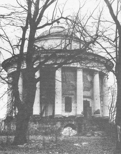 Перед въездом в Никольское был водоем, арка из дикого камня, пропускающая струю воды в полукруглый резервуар. Это – одно из увлечений Италией, испытанное владельцем и строителем Никольского Н.А. Львовым. Справа от дороги прудок, теперь частично заболоченный. В нем отражается, перебиваясь листами кувшинки и ряски, – ротондальный храм под куполом на световом барабане, обведенный кругом тосканскими колоннами прекрасных пропорций. Мягкие и тающие рассветные тени рисуют объемы, первые лучи нежаркого и уже немощного осеннего солнца ложатся на колонны розовыми бликами. Загорелся крест и золотой шар над куполом – если бы не они, чудесным перефразом античности, например, знаменитого круглого храма в Тиволи, можно было бы счесть это легкое и грациозное сооружение. Колонны маскируют толстые стены – в них внутри украшенные коринфскими колоннами ниши притвора и алтаря. Полуциркульные окна светового барабана льют рассеянный, несильный свет в круглый храм, сохранивший нетронутым нарядный классический иконостас и пышную бронзовую люстру, свисающую в центре. Плотно притесанные камни цоколя скрывают нижний храм, собственно усыпальницу. Здесь – низкий иконостас со съеденными сыростью иконами, возможно, кисти Боровиковского, а в полу – простые плиты с надписями. Под ними лежат и Н.А. Львов и жена его М.А. Дьякова, дважды запечатленная Левицким – в раннем возрасте, вскоре после тайного замужества, еще в жеманно-рокайльном вкусе, в тающих розовых и оливковых цветах, а на другом портрете представленная уже женщиной в расцвете, в теплых лиловатых тонах, женщиной в обаянии трепещущей и полной жизни плоти. На портретах Левицкого в Москве образы живых людей – в склепе Никольской церкви холодные и унылые мраморные доски. Так разными путями устремляется в вечность память о людях...