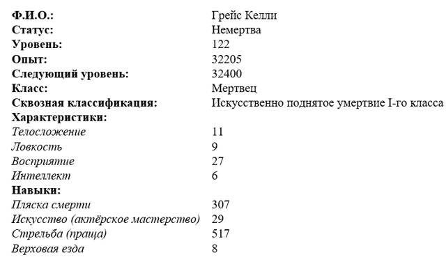 Разрезаю шею немёртвой и дожидаюсь, пока ассистент принесёт со склада кристалл. Чтобы не терять времени зря, смотрю на характеристики Келли и запоминаю их.