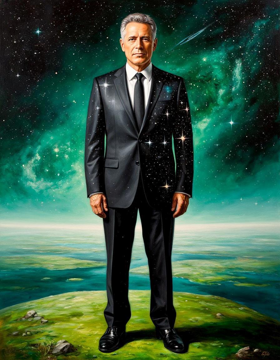 Одет он был в костюм… двойку? «Воспоминания» подсказывают, что так оно и есть. Брюки и пиджак. Чёрные. Но при этом… особенные. Вроде бы и обычные, но состояли словно из самого космоса, той пустоты, где жили и умирали звёзды. А вроде и был обычный. С какой стороны посмотреть. Но выглядело это эффектно.