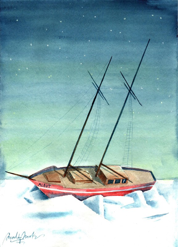 Шхуна завалилась на левый борт. Каких-либо следов вокруг неё не было видно. Бдительный Олесов всё же приказал остаткам своего потрёпанного отряда расположиться полукругом и первым направился к судну. Делал он это короткими перебежками. Со стороны было забавно наблюдать, как грузный, обременённый одышкой урядник с револьвером наизготовку, постоянно запинаясь о болтавшуюся на боку шашку, преодолев десять-пятнадцать шагов, со всего размаха падал лицом в снег. Отфыркиваясь, как старый морж, в ноздри которому попали мелкие ракушки или галька, абордажник вновь устремлялся к цели. Казус случился, когда Олесов достиг шхуны и попытался забраться на неё. Хотя «Алеут» сильно накренился и был сдавлен льдами, но высота бортов не позволяла уряднику легко преодолеть последнее препятствие. И он запросил подмогу.