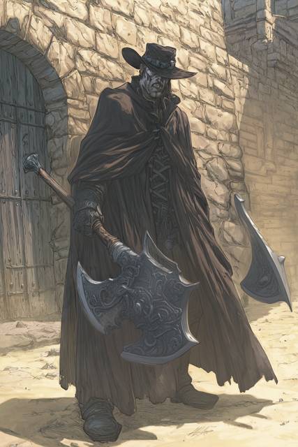 Облаченный в темно-коричневый плащ и все ту же ковбойскую шляпу воин стоял, держа в руке массивный боевой топор, отдаленно напоминающий раскрытую пасть рычащего монстра. С другой же стороны от него прямо в воздухе висел остро заточенный кусок металла, повторявший каждое микродвижение грозного оружия.