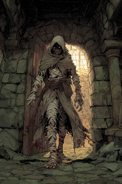 Я уже почти закончил с трапезой, немало намаявшись, запихивая еду под маску, как дверь в таверну в очередной раз распахнулась, и на пороге показался новый посетитель, мгновенно привлекший к себе всеобщее внимание. Он носил старый, грязный, истрепанный плащ, неспособный уже полностью укрыть тело, вот только кожу от солнца защищал не он, а заскорузлые бинты, намотанные в огромном количестве.