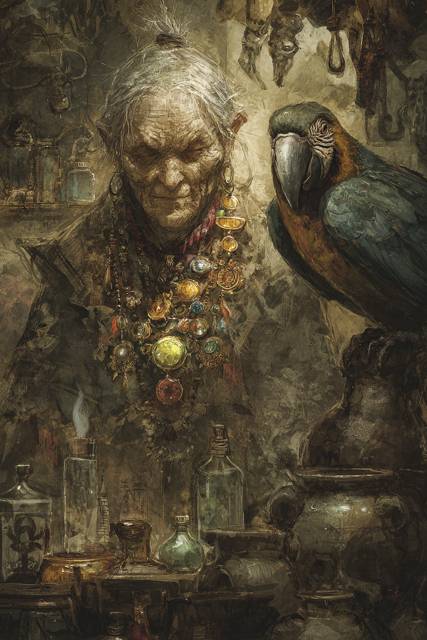 Рядом с Пифией на медном кувшине сидел большой попугай с изогнутым клювом, а шею ее украшало причудливое ожерелье с множеством камней всевозможных цветов. Причем часть из них определенно являлись обычными стекляшками и раскрашенными краской камнями, в то время как в других угадывались рубины, сапфиры, изумруды и прочие отнюдь не дешевые драгоценности.