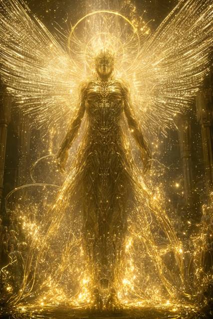 Как и Лайоллана, Сатвелеон полностью состоял из измененных частиц Межмировой Энергии. Только другого цвета. Ослепительно золотого. Они складывались в лучезарный облик, способный одновременно принадлежать как мужчине, так и женщине. Лицо скрывала золотая маска, над головой висело пульсирующее гало, а за спиной распахнулась пара сотканных их света величественных крыльев, от одного взгляда на которые любой ангел удавился бы от завести.