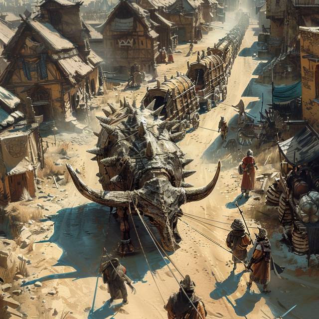 Трицебык представлял собой некую помесь вола и шипованной черепахи, а размерами ненамного уступал окружавшим его домишкам. Каждым шагом он взметал облака золотистой пыли и оставлял след в и без того утоптанной дороге.