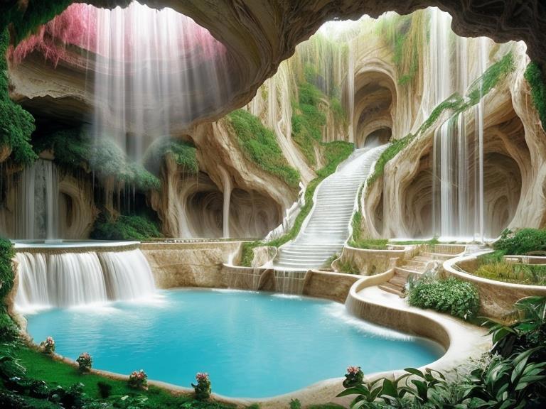 Отсюда открывался вид на залы и уровни подземного дворца. Пространство, заполненное садами, беседками и бассейнами, обрамляли уровни и террасы, выступающие из скальной стены, а сверху падал дневной свет из расщелины в своде этой гигантской пещеры. Белый камень бортиков и перил террас обрамлял растительный орнамент. Стены покрыты узором и переливающимися камнями. Стояла мебель, вышитая орнаментами, столики, инкрустированные декором. В саду внизу и на террасах росли зеленые и розовые кусты растений, такие же, как встречались на поверхности Парирамы.