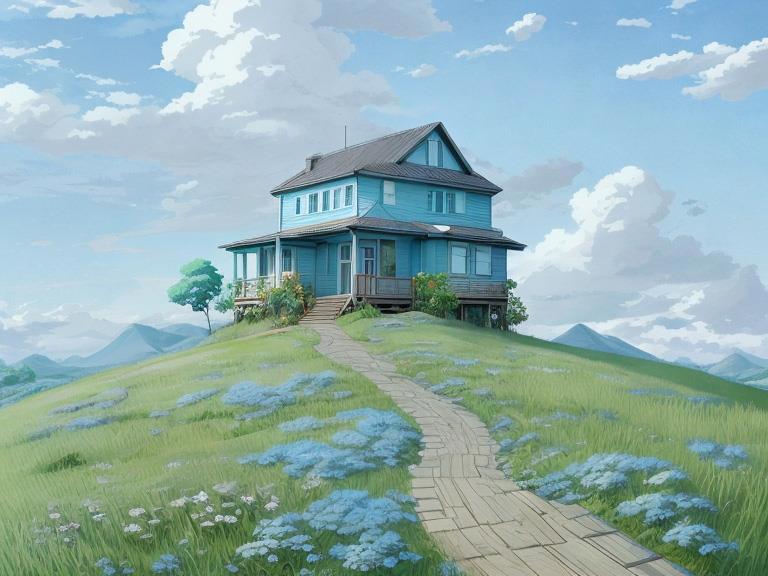 Из тумана проступил красивый голубой дом на холме. Совсем небольшой, двухэтажный.