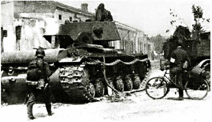 Брошенный на улице украинского городка трактор «Ворошиловец» с танком КВ-1 на буксире. Летом 1941 г Красная армия обладала уникальными возможностями эвакуации техники, но против нее работали глобальные стратегические факторы.