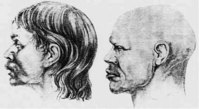 Ориньякские люди из грота Кроманьон. Графическая реконструкция (по женскому и мужскому черепам) М. М. Герасимова