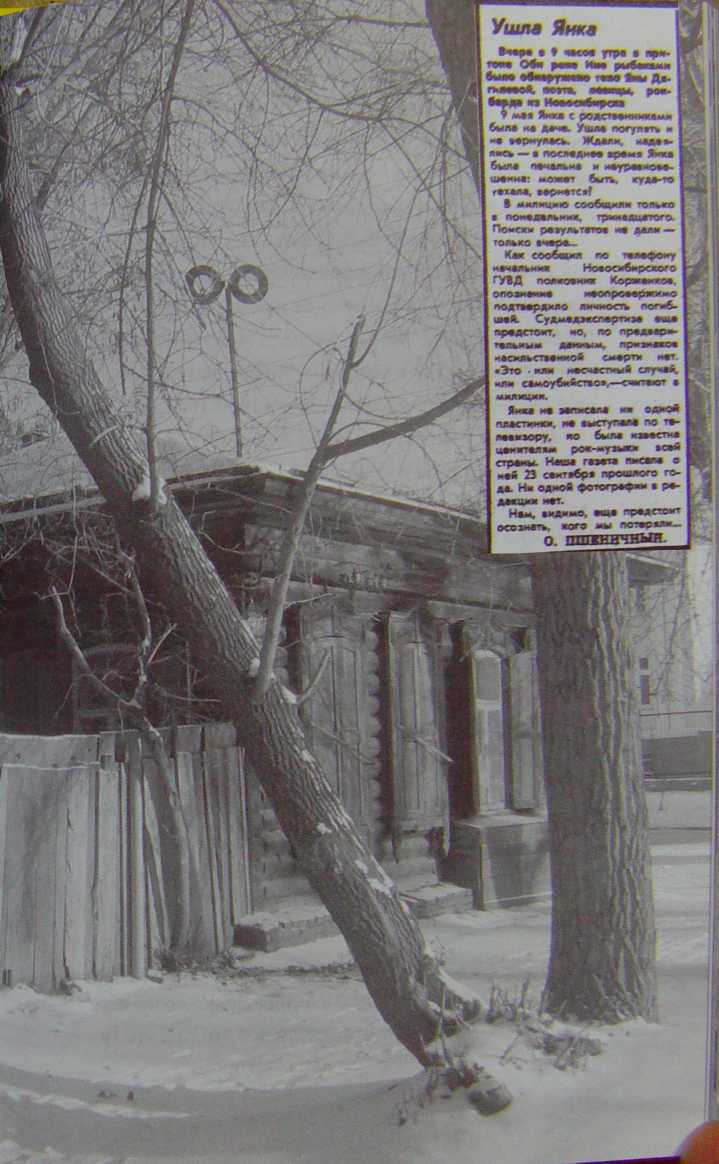 Мы уехали на Обское море. Классно погуляли, и тут Янкин отец звонит. А до этого у Аллы Викторовны, с которой он жил, сын погиб. У него в больнице поехала крыша, он выпрыгнул из окна, изрезался и истек кровью между гаражами. Ну и после похорон отец Янку чуть ли не насильно на дачу вытащил. Там была эта Алла Викторовна и подружка погибшего сына, уже беременная. У нее, кстати, потом выкидыш случился.
