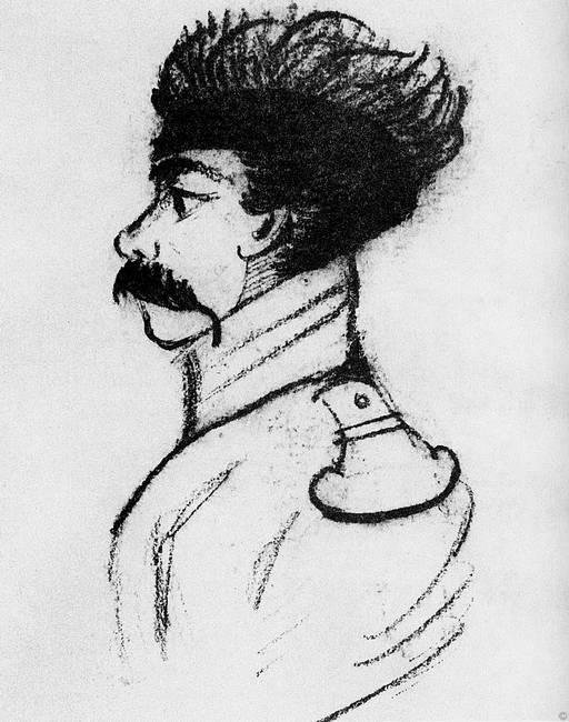 «Это был настоящий тип военного человека: он был высокого роста, смуглое его лицо имело какое-то свирепое выражение; большие черные навыкате глаза, всегда словно налитые кровью, сросшиеся густые брови, огромные усы, коротко остриженные волосы и черная повязка на лбу, которую он постоянно носил в это время, придавали его физиономии какое-то мрачное и вместе с тем поэтическое значение.