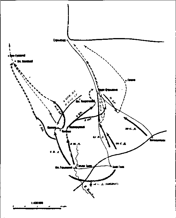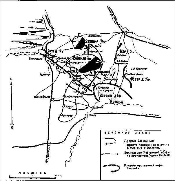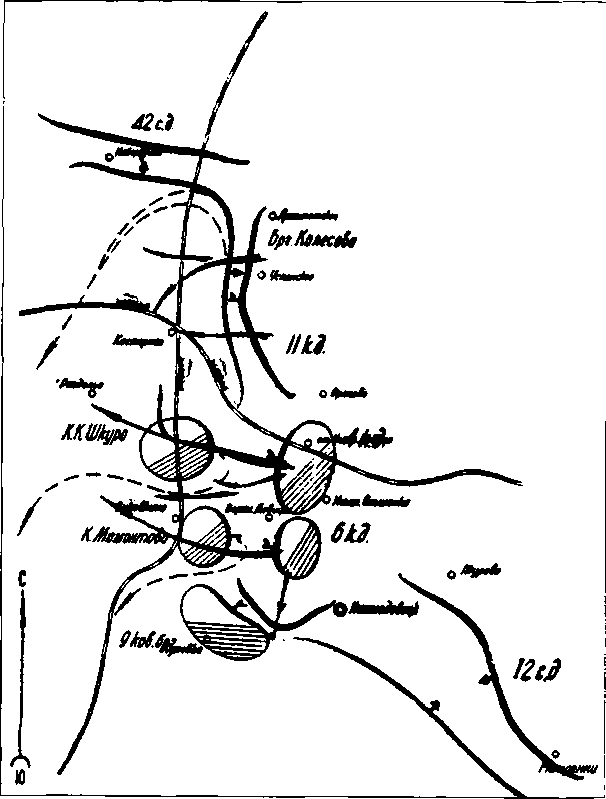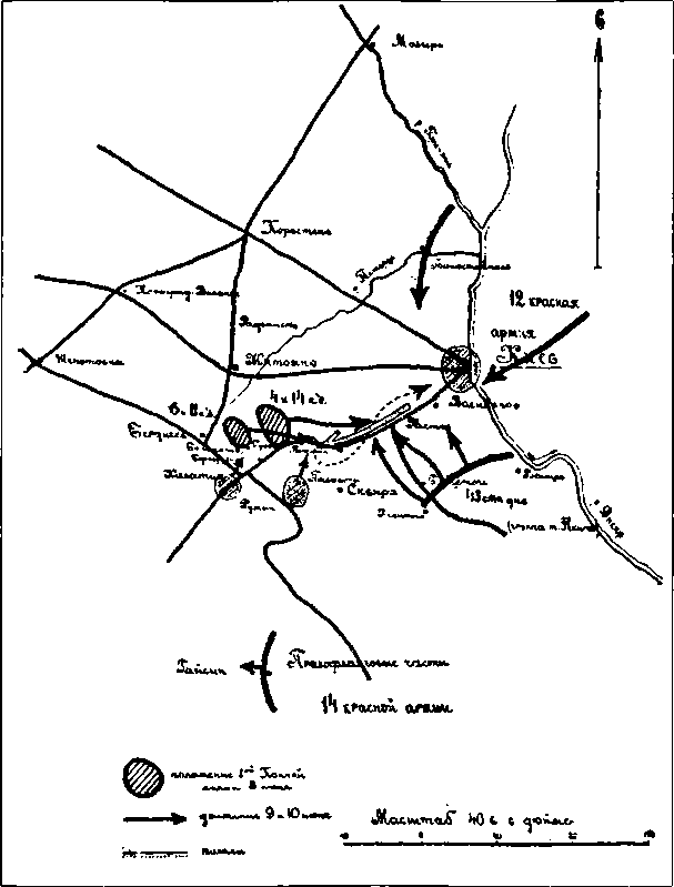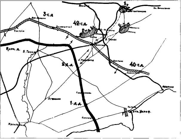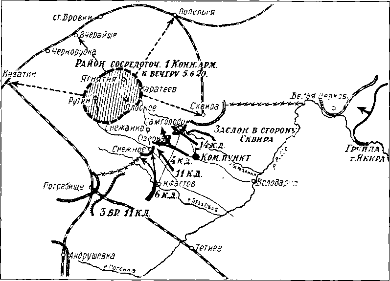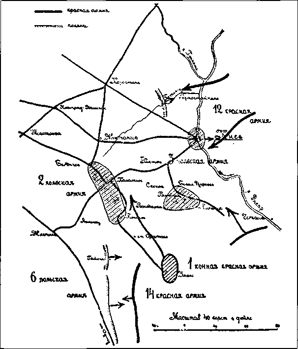 Конная армия была хороша и как крупный кавалерийский резерв в руках высшего командования. Но ей почти все время пришлось работать в узких коридорах, которые составлялись разграничительными линиями общевойсковых армий. И иногда ей приходилось много терять благодаря этим коридорам. А действия конных масс, связанные с разграничительными линиями и устанавливаемыми ими пределами, часто ведут к неудаче. Примером служат операции армии Буденного в районе Брод.