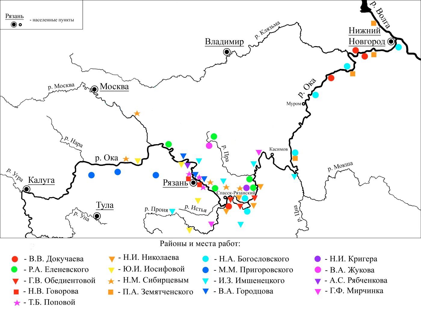 Рис. Места и районы долины реки Оки и ее притоков, фигурировавшие в физико–географических работах (теоретических обобщений либо анализа полевых данных)