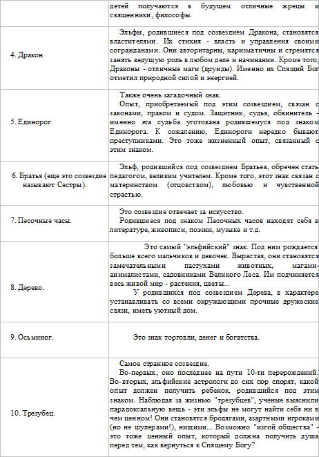 Государственная религия – культ Спящего Бога и звездного пути. Спящий Бог – олицетворение покоя и порядка. У него есть антипод – Пес Пустоты, олицетворение хаоса. Пёс раз в сутки откусывает от тела Спящего Бога небольшой кусочек и этот кусочек – новая душа, которая должна пройти 10 перерождений на земле, чтобы иметь возможность вернуться обратно к Богу. Эльфы верят, что после смерти душа отправляется в путешествие по звездам Млечного пути и через определенный промежуток времени воплощается в теле новорожденного эльфа. Суть религии состоит в том, что каждое перерождение происходит под одним из 10 созвездий или знаков Спящего Бога. Каждый знак определяет судьбу новорожденного с точки зрения опыта, которая душа эльфа должна получить, прожив эту жизнь. Только пережив 10 воплощений и родившись последовательно по 10-ю созвездиями, душа приобретает весь доступный на земле опыт, становится способной избежать пасти Пса Пустоты и слиться обратно со Спящим Богом. Души, оторванные от Бога, страдают от одиночества и неполноценности и всеми силами стремятся к Великому слиянию. Но способны к этому только те, которые прошли все 10 этапов без ошибок. Бывает так, что душа не хочет получать какой-нибудь ценный опыт и законы мироздания вновь и вновь возвращают ее в ту ситуацию, заставляя родиться под тем же самым созвездием. Только пройдя полностью требуемый этап, можно перейти к следующему и родится под новым Знаком. Вот эти Знаки: