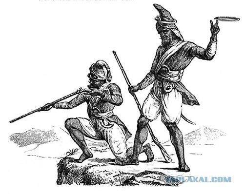 Все изменил стук копыт, похожий на удары в большие тамтамы на боку слонов махараджей, столь мощный, что сразу становилось понятно – скачут тысячи коней. И они приближались с тыла! Лейк стремительно развернулся и похолодел: на фоне встающего солнца, еле-еле пробивающегося сквозь густую дымку, к батареям артиллерийских рот стремительно приближалась конная армия. Необычная. Под черным флагом. Всадники везли на крупах своих лошадей маленьких пехотинцев. Повернуть орудия на восток пушкари не успевали – они так и погибли около своих пушек, смотрящих на запад, пали под ударами кривых шашек. Лейк ретировался со своей свитой под защиту резервных батальонов, которые, заняв позицию в бывшем лагере сикхов, спешно формировали каре. На них чуть не набросилась многочисленная конница на низких лошадях. Потерпев неудачу с полками в английском тылу, она устремилась дальше, заходя в тыл шеренгам, ведущим перестрелку с беломундирниками, а на сикхский лагерь начали наступать гуркхи перекатными цепями. Первая линия делала выстрел. Пока она перезаряжалась, вторая линия пробегала вперед и тоже стреляла. Далее следовала третья, четвертая… Эта необычная тактика тут же принесла свои плоды. «Легкие роты» резерва отстреливались, но их огонь, малорезультативный, не мог переломить ситуацию (1).