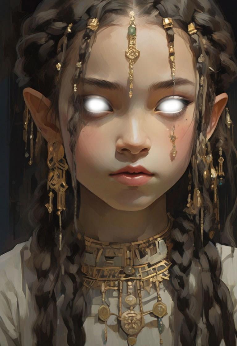 Ноги сами собой несли гостя, словно он знал, как пройти к месту, где повернуть. Концом пути оказалась темная комната без окон, в которой сидела маленькая девочка д’эви. Выглядела она совсем малышкой – лет пять-шесть на людской манер. Она была одета в пеструю рубаху до колен, расшитую бисером и стеклянными бусинами. Прическа ее представляла собой сотни тонких косичек, каждую из которых украшало нечто особенное.