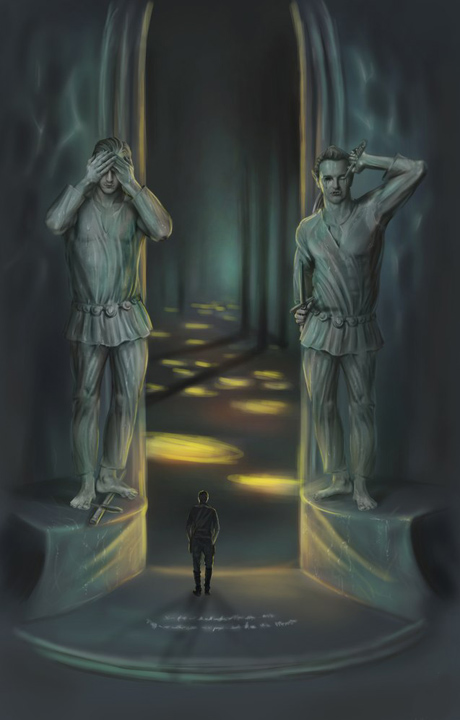 Я остановился, прислушался. Минуты сменялись минутами, но больше криков слышно не было. Пройдя Лестничный зал насквозь, протопав через несколько холлов, я оказался перед входом в зал, где был свет, и поспешно загасил "огонек". Клянусь всеми богами, но следующий зал в картах указан не был. Вход высотой и шириной не уступал Створкам. Вновь, как и перед залами Уснувшего Эха, меня встречали две статуи. Справа орк, слева эльф. Двуручный меч орка сломан, и Первый с бесстрастной физиономией выкалывал стилетом себе правый глаз. Вместо левого уже зияла пустая глазница. Меня аж передернуло – огромная, в пять человеческих ростов статуя казалась живой. Скульптор (впрочем, как и все строители Храд Спайна) был наделен талантом самих богов. Эльф сохранил свой меч в целости, но оружие демонстративно лежало у босых ног, рукоятью в мою сторону. Я хмыкнул (ну не каждый же день увидишь, как эльф добровольно отказывается от своего оружия!). Глаза эльф решил поберечь и не пихать в них всякого рода острые предметы и попросту прикрыл их руками. М-да… Вот и пойди пойми, что хотели сказать этими статуями строители! На полу вновь оказались надписи. Я уж было хотел пойти дальше, но выдавленные в плитах буквы полыхнули серым жемчужным светом, призывая обратить на них самое пристальное внимание. Ну я и обратил.