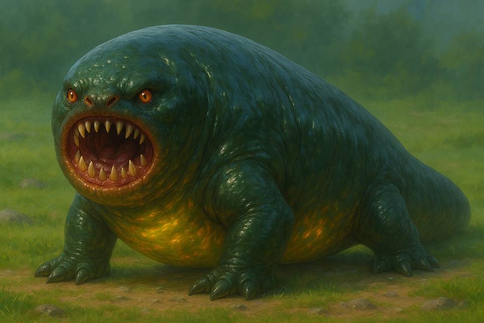 Лапы у чудовищ были мощные, но короткие, так что брюхо тащилось по настилу, оставляя скользкие следы. Чёрные, загнутые когти легко вонзались в дерево, удерживая тушу, чтобы она не опрокинулась под собственным весом. Хвоста у этих созданий не было вовсе, и от этого они казались ещё более уродливыми – как живые мешки с зубастой дырой спереди.