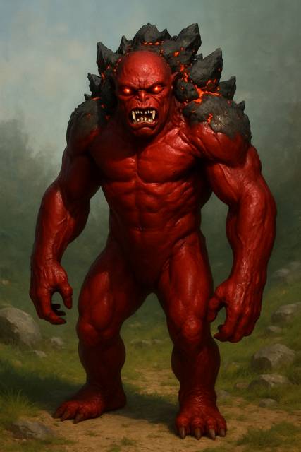 Кожа у чудища была ярко-красная, словно с трудом натянутая на каменные мышцы, и свету она блестела липким, маслянистым отблеском, словно тварь только что вышла из вязкой смолы. Плечи и верхняя часть спины, были утыканы острыми наростами, похожими на обломки чёрной породы. В их трещинах мерцал красный свет, и оттуда время от времени наружу вырывались струйки густого серого дыма, создавая стойкое ощущение, что внутри этой туши бурлит лава.