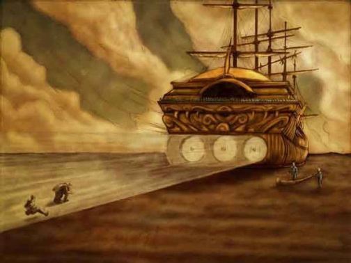 ) Из-за далекого горизонта показался великолепный фреольский корабль – пятимачтовый, весь в парусах. Через восемь секунд он нас настиг. По обе стороны корпуса подвешен рой скоростных колесниц, хлопая по траве, а высоко над мачтами реют крылья парапланов. Я не знаю ни как судно нас углядело, ни как затормозило. Знаю только, что оно прошло в десяти шагах от меня и пробороздило орду посредине, никого не затронув. Когда земля прекратила колыхаться, они подняли бортовые элероны, втянули сошники и дали корпусу плавно остановиться. Дерево заскрежетало по ковру полегших трав. Я услышал стучание колес прицепленных колесниц, хлопанье крыльев при остановке и трепетание на ветру полотна тормозных воздушных змеев. После этого наступило некое подобие тишины. И три отрывистых сигнала трубы. Чтобы нам было ясно, кто именно они такие.