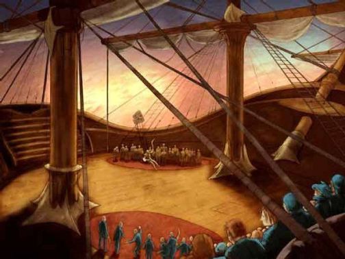 π Голгот качнул головой. Я улыбаюсь, когда меня называют «Принцем». Никто в орде так уже не говорит. Мы все собрались на юте вместе с обоими капитанами, с рулевыми и картографами. Внимание у всех на пределе, пусть даже у кого-то трещит голова и он не выспался... Корабль слегка покачивается. Непривычно для нас. Деревянный настил, на котором мы сидим, поистине превосходен. Солнце уже высоко. Оно расцвечивает оранжевые тона убранных парусов.
