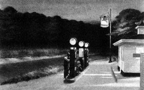Машин на шоссе мало, лишь изредка на встречной полосе сверкают фары машин, так же стремительно несущихся в противоположном направлении прочь из ночной тьмы, от приборной панели по салону расходится едва заметное красновато-фиолетовое свечение. Неожиданно впереди в разрыве между деревьями появляется залитое ярким светом пятно: это заправочная станция, последняя по времени – перед наступлением ночи и в пространстве – перед тем, как дорога нырнет из полей и перелесков в густую лесную чащу. «Заправка» (1940). Управляющий станцией вышел из вагончика дежурного оператора, чтобы проверить показания счетчика одной из колонок. Помещение заправочной станции освещено ярко, как днем. Это видно по вырывающемуся через открытую дверь лучу света. Там, внутри, скорее всего, играет радио, вдоль стен выстроились канистры с маслом и стеллажи со сладостями, журналами, дорожными картами и тряпками для протирки окон.
