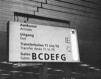 Я вышел из самолета в амстердамском аэропорту Схипхол и, пройдя буквально несколько шагов по зданию терминала, обратил внимание на висевший под потолком указатель с информацией о местонахождении стойки регистрации транзитных пассажиров и о том, как пройти к выходу и в зал ожидания. Этот указатель меня просто поразил. Нет, на первый взгляд, в нем не было ничего особенного: просто яркий желтый прямоугольник примерно метр в высоту и два в длину, предельно простой по дизайну – пластиковая панель, вставленная в освещенный изнутри алюминиевый короб, который подвешен на стальных кронштейнах к потолку, покрытому, как паутиной, целой сетью каких-то проводов, кабелей и воздуховодов от кондиционеров. Несмотря на всю свою простоту и, я бы даже сказал, обыденность, указатель очень порадовал меня, да что там порадовал он действительно доставил мне огромное удовольствие, причем, как это ни странно, не чем-нибудь, а своей зкзотичностью. Экзотичность выражалась сразу в нескольких деталях: в удвоенной букве «а» в слове Aankomst, в непривычном для английского языка соседстве букв «u» и «i» в слове Uitgang, в использовании дублирующих английских подписей к основным словам, в слове balies, обозначающем «стойки регистрации», и в использовании лаконичных, практичных и удобных для восприятия современных шрифтов «Фрутигера» и «Юниверса».